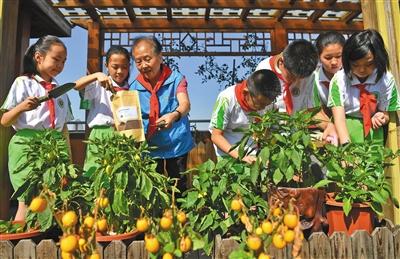 在学校屋顶生态园,“环保奶奶”居月茹教同学们为植物上肥料。负责实验研究的江祎老师介绍,“学生们利用平时收集的厨余垃圾制成的堆肥,进行屋顶种植,在享受垃圾分类成果的同时,既增长了见识也美化了环境。”