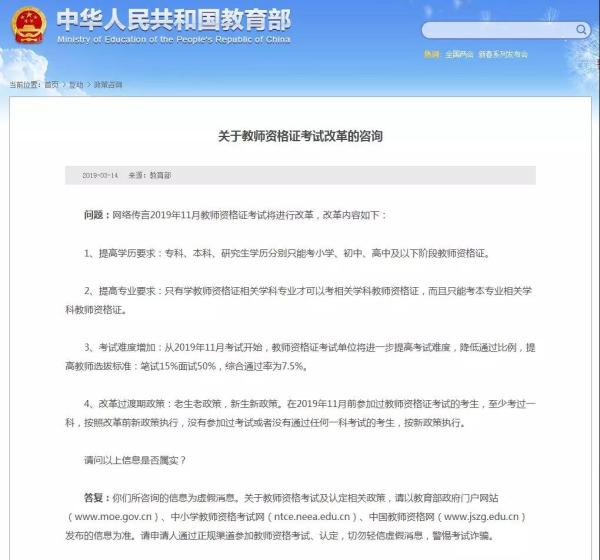 当时,教育部对此明确作出回应:此为虚假消息。关于教师资格考试及认定相关政策,请以教育部政府门户网站(www.moe.gov.cn)、中小学教师资格考试网(ntce.neea.edu.cn)、中国教师资格网(www.jszg.edu.cn)发布的信息为准。请申请人通过正规渠道参加教师资格考试、认定,切勿轻信虚假消息,警惕考试诈骗。