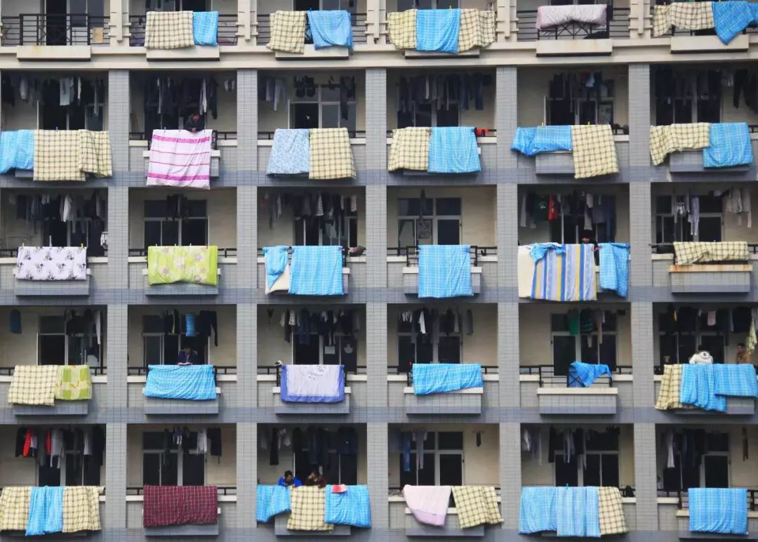 2012年3月6日,江苏一幢学生宿舍楼上晒满了衣被。图/图虫创意