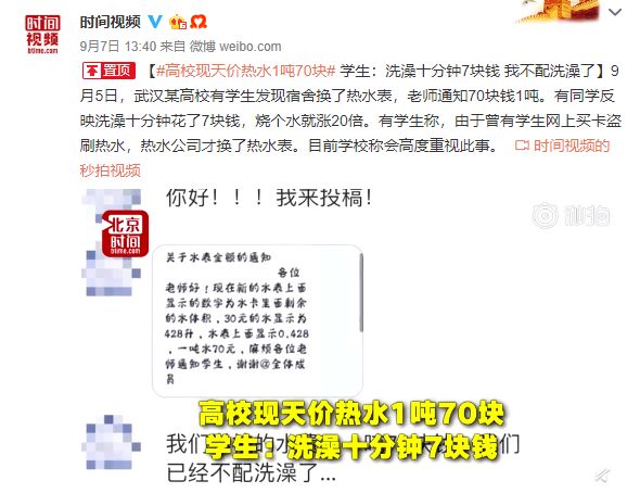 就在9月5日,武汉一高校有学生反映宿舍换了新的热水表,“天价”的热水令学生大呼洗不起澡。70块钱一吨、十分钟就花掉7块钱的水打在身上,让同学们大呼痛在心里。