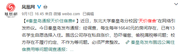 不久前,东北大学秦皇岛分校有新生反映,学校的新宿舍鹏远公寓一学期的费用高达16640元,其中住宿费1200元,服务费14000元。此般收费标准摆出来,差点就让人以为这位同学读的是著名奢华高校艾利斯顿商学院。