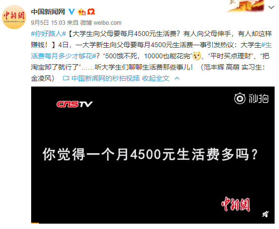 前几天,一名大一女生的求助帖走红,她希望妈妈每月能给自己4500元的生活费,却遭到拒绝。女孩感到很委屈,因为她觉得一个月2000元根本不够花。
