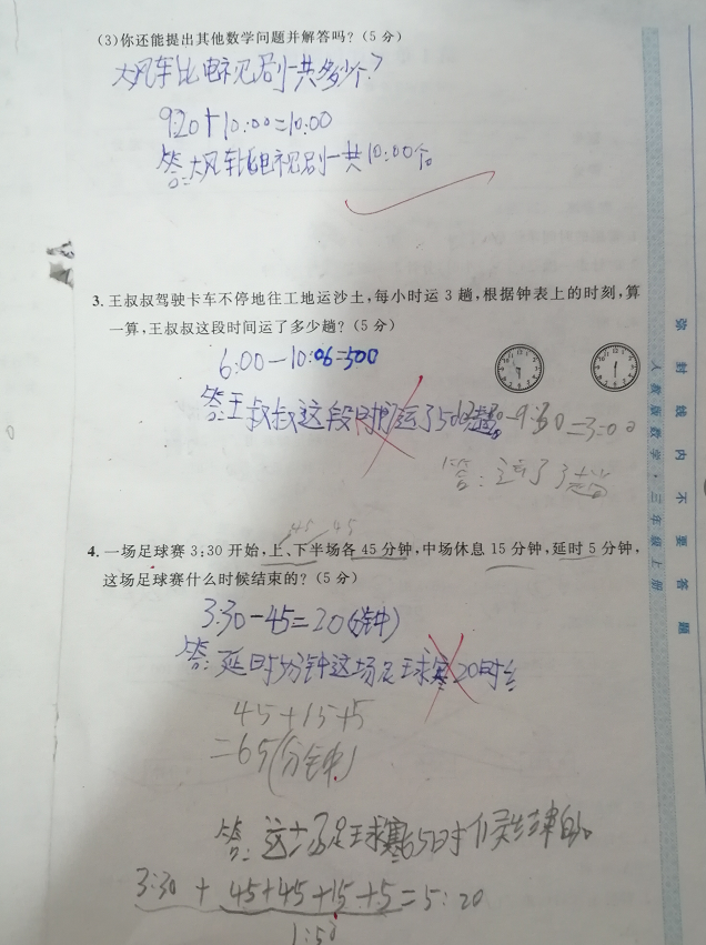 我们先来看他的卷面书写,比较潦草,很显然,他在学习中,一点也不认真。其次,小学三年级,小学生应该已经养成了良好的书写习惯,有了一定的数学基础,但是看这位同学,他还不具备这些。