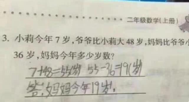 这道二年级数学题,其实很好做,爷爷比小莉大48岁,用7加上48,得到爷爷的年龄是55岁,妈妈比爷爷小36岁,再用55减去36,得到妈妈的年龄是19岁!