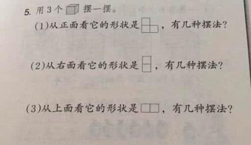 这类数学题,是小学生在认识立方体的时候,要做的。出题的目的,是培养二年级小学生空间想象的能力,以及观察思考的能力。我们来看题目,确实有些难,而且,开放性比较大,有些题,并不是唯一的答案!但是呢,尽管家长觉得很难,甚至不可思议,也是可以做出来的,最好能让孩子们找来正方体,动手摆一摆,那么,答案很快就出来了!
