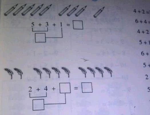 比如,第一个,先用5加3,所得结果填入下面的方框中,是8,再用8加上1,所得结果填入等号后面的方框里。这样做,目的是在教会二年级小同学,同级运算,要按照从左往右的顺序,进行计算。