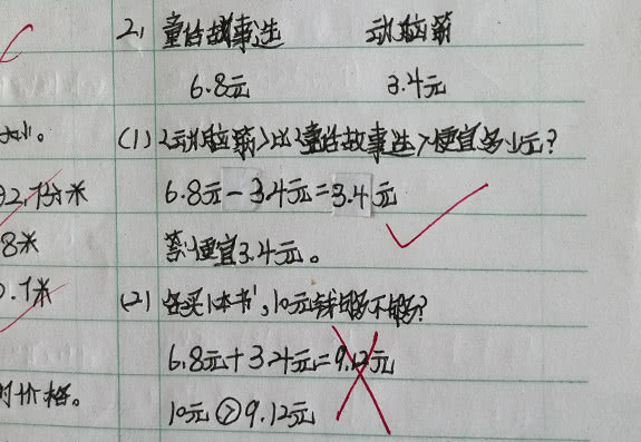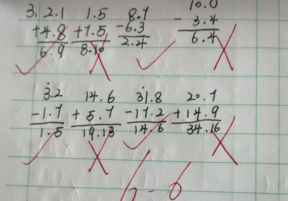 这位小学生,8道小数的加减运算,她就做错了4道,可以说,错题有点多,看上去也有点“触目惊心”!