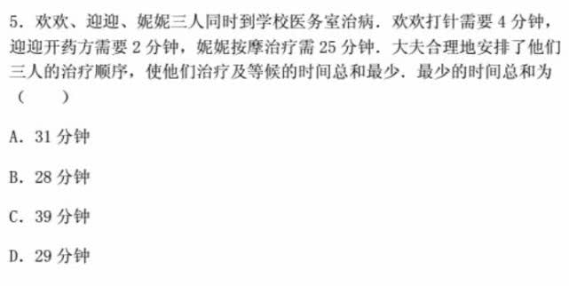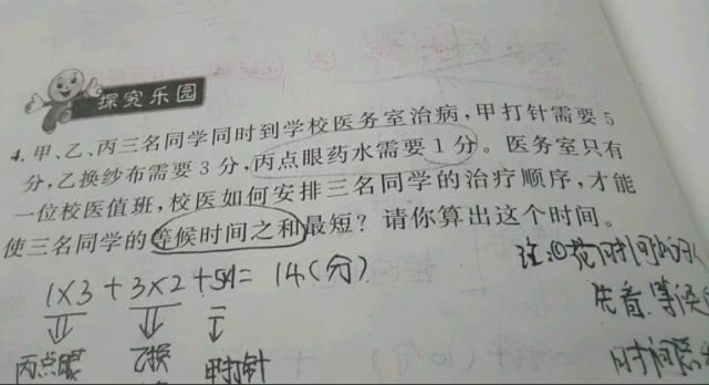 如果我们让甲先进行治疗,那么,其他两名同学,都得至少等待5分钟才行,这样的话,是不科学的。所以,如果我们让用时最少的丙同学,先来治疗,那么,其他两名同学,至少只需要等待1分钟。