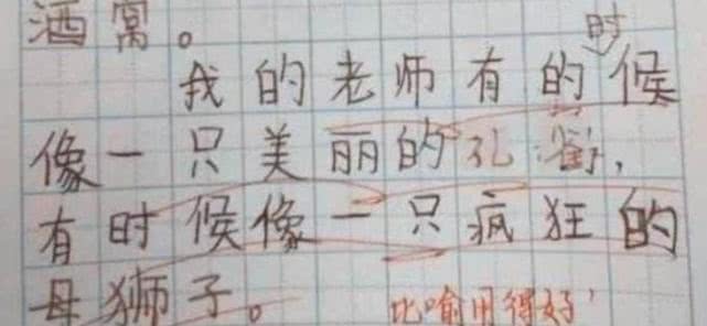 对于老师,小学生都是如何感知的呢?既像美丽的孔雀,又是疯狂的母狮子,看到这儿,老师又该大笑呢,还是该生气呢?这位老师十分“镇定”:同学,比喻用得很好!