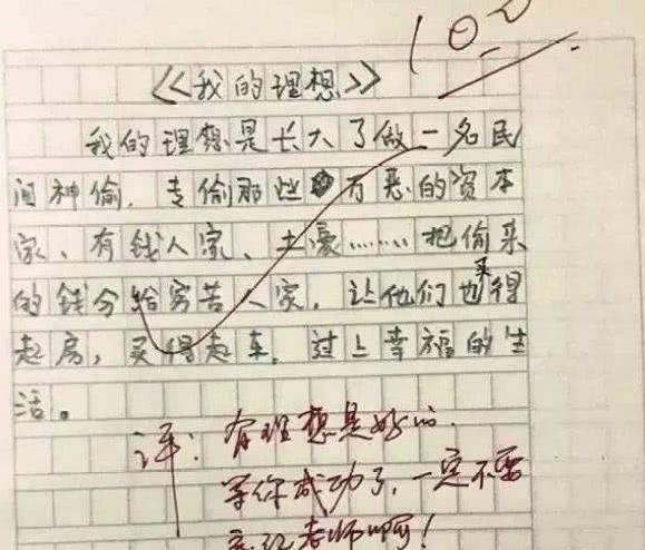 同学,你的理想好远大呀!简直就是一个劫富济贫的幻想家啊!老师也表示无奈:有理想是好的,等你成功了,一定不要忘记老师哪!不过,顺便提醒一下,同学,要注意你的同桌,你的同桌,有一个理想,是当警察哦!