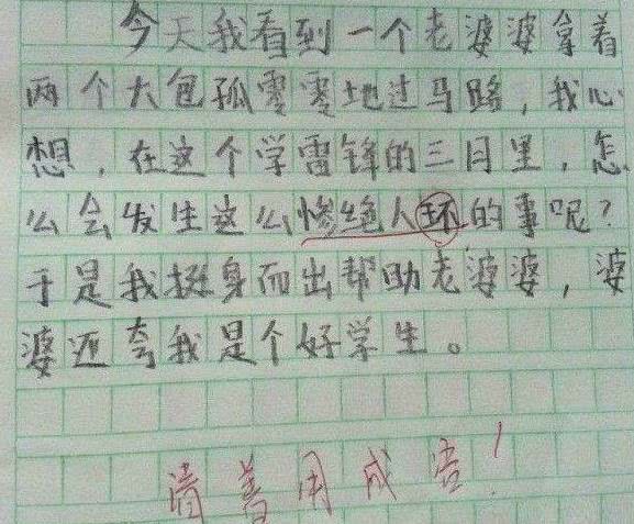 小学生在写作文的时候,经常会遇到用词不当的情形,像上图当中的这篇作文,小学生竟然用了“惨绝人寰”这个词,很显然,用词不当,老师的回复,也恰如其分。
