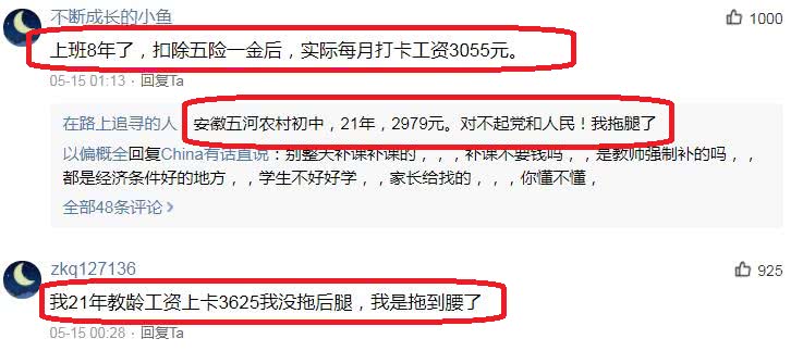 看上图中三位老师,一位是教龄8年的老师,每个月,只能拿到3千多元,严重拖后腿!另一位来自安徽一所初中,教龄21年,月入不到3千,更是拖后腿!还有位教龄21年的老师,以他每月3600多的工资,也没能达到教育行业的平均水平!