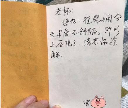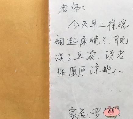 上面写着:老师:今天崔**起床晚了,耽误了早读,请老师原谅她,家长:罗**。